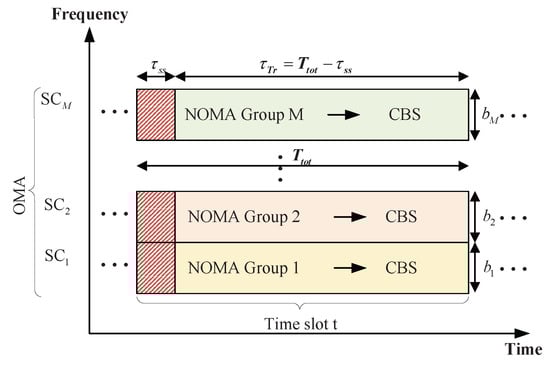 The network system operation is illustrated in Figure 2. In particular, at the beginning of a time slot, with duration , all CUs concurrently perform spectrum sensing and report their local results to the CBS. Based on these sensing results, the CBS first decides the global sensing result as to whether the primary channel is busy or not following the combination rule [35,36], and then allocates power and bandwidth to all CUs for uplink data transmission. As a consequence, according to the allocated power and bandwidth of the NOMA groups, the CUs in each NOMA group can transmit their data to the CBS through the same subchannel without causing interference with other groups within duration , where is the total time slot duration. Information regarding the remaining energy in all the CUs is updated to the CBS at the end of each time slot. Each data transmission session of the CUs may take place in more than one time slot until all their data have been transmitted successfully.