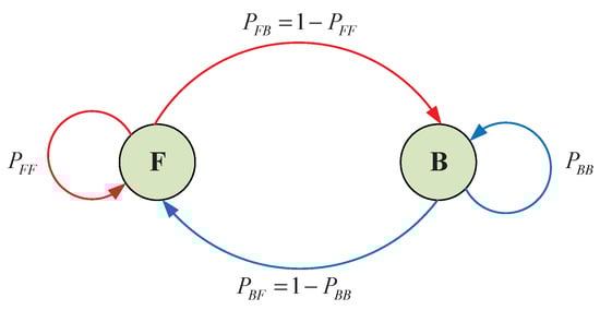 Herein, we use a two-state Markov discrete-time process to model the state of the primary channel, as depicted in Figure 3. We assume that the state of the primary channel does not change during the time slot duration, , and the primary channel can switch states between two adjacent time slots. The state transition probabilities between two time slots are denoted as , in which F stands for the free state, and B stands for the state. In this paper, we consider cooperative spectrum sensing, in which all CUs collaboratively detect spectrum holes based on an energy detection method, and they send these local sensing results to the CBS. Subsequently, the final decision on the primary users’ activities is attained by combining the local sensing data at the CBS [36]. The performance of the cooperative sensing scheme can be evaluated based on probability of detection and probability of false alarm . is denoted as the probability that the PU’s presence is correctly detected (i.e., the primary channel is actually used by the PUs). Meanwhile, is denoted as the probability that the PU’s is detected to be active, but it is actually inactive (i.e., the sensing result of the primary channel is busy, but the primary channel is actually free).