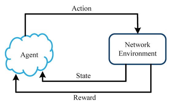 Generally, the purpose of reinforcement learning is for the agent to learn how to map each system state to an optimal action through a trial-and-error learning process. In this way, the accumulated sum of rewards can be maximized after a number of training time slots. Figure 4 illustrates the traditional reinforcement learning via agent–environment interaction. In particular, the agent observers the system state and then chooses an action at the beginning of a time slot. After that, the system receives the corresponding reward at the end of the time slot, and transfers to the next state based on the performed action. The system will be updated and will then go into the next interaction between agent and environment.