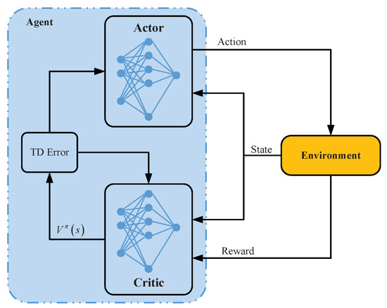 The maximization problem in Equation (17) can be solved by using the actor-critic method, which is derived by combining the value-based method [43] and the policy-based method [44]. The actor-critic structure involves two neural networks (actor and critic) and an environment, as shown in Figure 5. The actor can determine the action according to the policy, and the critic evaluates the selected actions based on value functions and instant rewards that are fed back from the environment. The input of the actor is the state of the network, and the output is the policy, which directly affect how the agent chooses the optimal action. The output of the critic is a state-value function , which is used to calculate the temporal difference (TD) error. Thereafter, the TD error is used to update the actor and the critic.