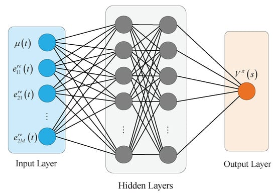 Figure 6 depicts the DNN at the critic, which is composed of an input layer, two hidden layers, and an output layer. The critic network is a feed-forward neural network that evaluates the action taken by the actor. Then, the evaluation of the critic is used by the actor to update its control policy. The input layer of the critic is an environment state, which contains elements. Each hidden layer is a fully connected layer, which involves neurons and uses a rectified linear unit (ReLU) activation function [45,46] as follows: