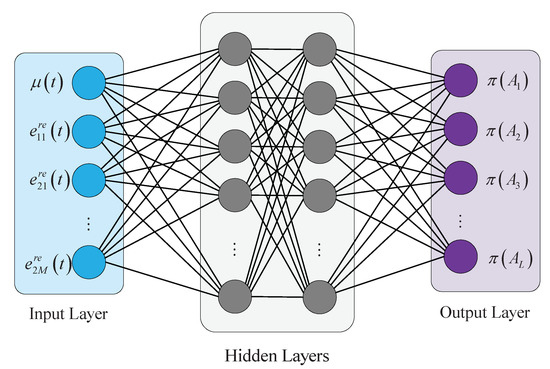 The DNN in the actor is shown in Figure 7, which includes an input layer, two hidden layers, and an output layer. The input layer of the actor is the current state of the environment. There are two hidden layers in the actor, where each hidden layer is comprised of neurons. The output layer of the actor provides the probabilities of selecting actions in a given state. Furthermore, the output layer utilizes the soft-max activation function [28] to compute the policy of each action in the action space, which is given as: