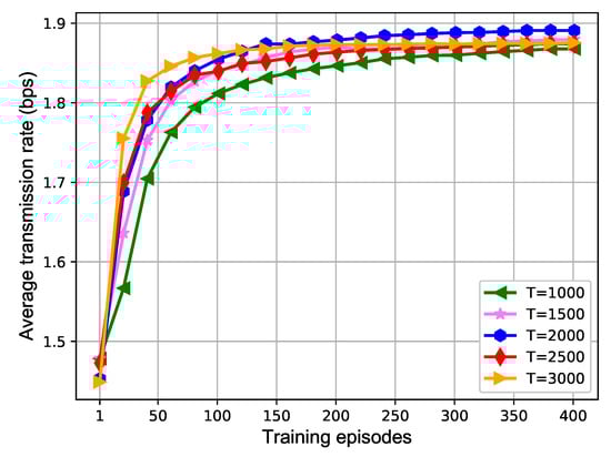 We first examine the average transmission rates of the the DACRL scheme under different training iterations, T, while the number of episodes, L, increases from 1 to 400. We achieved the results by calculating the average transmission rate after separately running the simulation 20 times, as shown in Figure 8. The curves sharply increase in the first 50 training episodes, and then gradually converge to the optimal value. We can see that the agent needs more than 350 episodes to learn the optimal policy at iterations per episode. However, with the increment in T, the algorithm begins to converge faster. For instance, the proposed scheme learns the optimal policy in less than 300 episodes when . Nevertheless, it might take a very long time for the training process if each episode uses too many iterations, and the algorithm evenly converges to a locally optimal policy. As a result, the number of training iterations per episode and the number of training episodes should not be too large or too small. In the rest of the simulations, we set training episodes at 300 and training iterations at 2000.