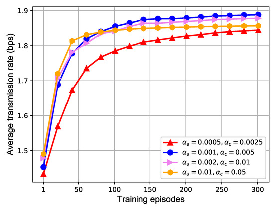 Figure 9 shows the convergence rate of the proposed scheme according to various values of actor learning rate and critic learning rate . The figure shows that the reward converges faster with increments in the learning rates. In addition, we can observe that the proposed scheme with actor learning rate and critic learning rate provides the best performance after 300 episodes. When the learning rates of the actor and the critic increase to and , respectively, the algorithm converges very fast, but does not bring a good reward due to underfitting. Therefore, we set the actor and critic learning rates at and , respectively, for the rest of the simulations.