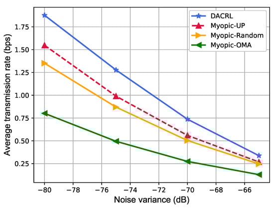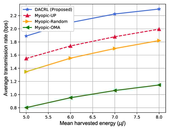 Figure 10 illustrates the average transmission rates under the influence of mean harvested energy. We can see that the average transmission rate of the system increases when the mean value of harvested energy grows. The reason is that with an increase in , the CUs can harvest more solar energy, and thus, the CUs have a greater chance to transmit data to the CBS. In addition, the average transmission rate of the proposed scheme dominates the conventional schemes because the conventional schemes focus on maximizing the current reward, and they ignore the impact of the current decision on the future reward. Thus, whenever the primary channel is free, these conventional schemes allow all CUs to transmit their data by consuming most of the energy in the battery in order to maximize the instant reward. This makes the CUs stay silent in the future due to energy shortages. Although the Myopic-Random scheme had lower performance than the Myopic-UP scheme, it still had greater rewards than Myopic-OMA. This outcome demonstrates the efficiency of the hybrid NOMA/OMA approach, compared with the OMA approach, in terms of average transmission rate.