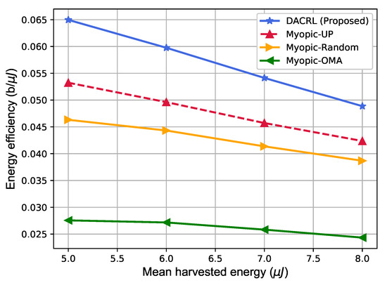 In Figure 11, the energy efficiency of the schemes was compared with respect to the mean value of the harvested energy. In this paper, we define energy efficiency as the transmission data rate obtained at the CBS over the total energy consumption of the CUs during the operations. We can see that the energy efficiency declines as rises. The reason is that when the harvested energy goes up, the CUs can gather more energy for their operations; however, the amount of energy overflowing the CUs’ batteries also increases. The curves show that the performance of the proposed scheme outperforms the other conventional schemes because the DACRL agent can learn about the dynamic arrival of harvested energy from the environment. Thus, the proposed scheme can make proper decision in each time slot.
