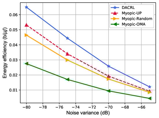 In Figure 12 and Figure 13, we plot the average transmission rate and the energy efficiency, respectively, based on differing noise variance at the CBS. The curves show that system performance notably degrades when noise variance increases. To explain this, noise variance will degrade the data transmission rate, as shown in Equation (3). As a consequence, energy efficiency also decreases with an increment in noise variance. Based on noise variance at the CBS, the figures verify that the proposed scheme dominates the myopic schemes.