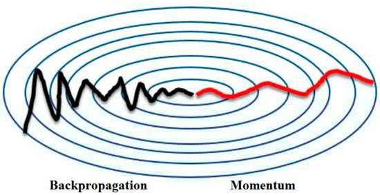 It is possible to make more precise the convergence of the backpropagation by using the momentum [,,,]. The goals of the momentum are to increase the movements in the correct direction, and to decrease the movements in the incorrect directions. The momentum takes into account the past backpropagation to smooth the updating.