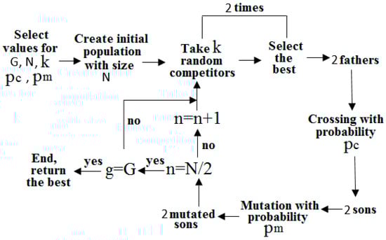 We use the following parameters: is the generation number, is the size of the population, is the probability of crossing, is the probability of mutation, is the size of the chromosome, and are the competitors in the selection per tournament. The methodology of the algorithm shown in Figure 4 is used to find the best values of the hyper-parameters and it is described as: