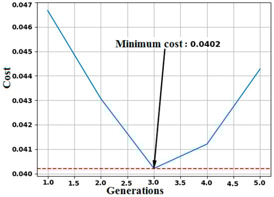 The Figure 11 shows a zoomed-in view of the costs of Equations (7) and (8) for the genetic algorithm with RBM network in comparison with the modified backpropagation during the training after 100 epochs. The genetic algorithm with RBM network has more precise modeling.