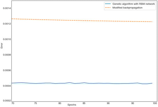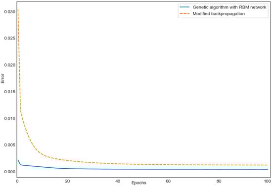 The modeling of the genetic algorithm with RBM network of Equations (1)–(8), Figure 4 and Figure 9, and Table 2 in comparison with the modified backpropagation of Equations (1)–(4) during the training is shown in the Figure 12. After 100 epochs, the genetic algorithm with RBM network has a more precise modeling compared to the modified backpropagation.
