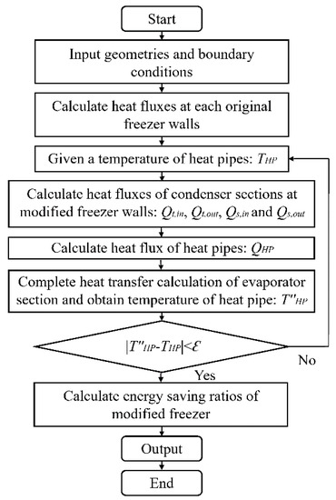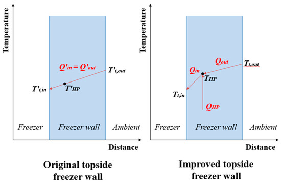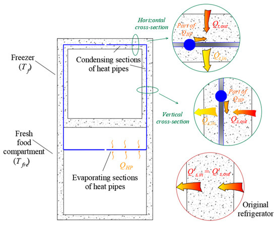 The refrigerator is improved by wasted cold energy recovery at the freezer. As is compared in Figure 1, the modified walls of the improved freezer have a shunted heat transfer process. As one part of heat comes from the fresh food compartment, the heat leakage from the ambinet is reduced. The heat transfer processes of original and modified topside freezer walls are compared in Figure 3 as an example. The heat pipes change the temperature distribution of the freezer wall. In comparison of the installation position of heat pipes, the local temperature (T′HP) is raised to the temperature of the heat pipes (THP). Thus, the external heat flux (Qout) decreases, whereas the internal heat flux (Qin) increases. The heat flux difference between them (QHP) is acquired from the fresh food compartment using heat pipe. It should be emphasized that the heat transfer enhancement between the fresh food compartment and freezer (which could also be easily done by reducing its internal thermal isolation) is just a side effect, and the main purpose of adding heat pipes is to decrease the overall heat leakage of the improved refrigerator.
