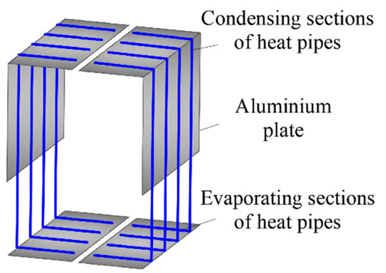 The improved refrigerator is designed based on a Midea refrigerator numbered BCD-111, as shown in Figure 1. Two symmetrical heat pipes are installed into the refrigerator for reusing the wasted cold energy of the freezer. More specifically, only topside and side freezer walls are changed, and eight aluminum heat pipes are used to transport part of their cold loss to the fresh food compartment, as is depicted in Figure 2. Aluminum plates are adopted to enhance the heat transfer at evaporating and condensing sections. The diameter of the heat pipe and the thickness of aluminum plates are preliminarily designed as 6 mm. The evaporating sections of the heat pipes are designed to offer a support plate for the fresh food compartment.