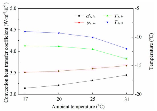 Ambient temperature seriously affects the operating state of household refrigerators. When the temperature gear of the BCD-111 refrigerator is fixed to C, the temperature boundary conditions at ambient temperatures of 17.0 °C to 31.0 °C are adopted for analyzing the performances of the improved refrigerator. The common ratio of wall thickness inside of heat pipes to the whole wall thickness, Xin (namely Xin = Xt,in = Xs,in), is preliminarily set to 16%. The heat transfer area of the evaporating section of heat pipes (Aeva) is given as its maximum value of 0.146 m2. In the side and the topside freezer walls of the improved refrigerator, considerable heat is transported to the freezer by heat pipes, which changes the thermal characteristics of the freezer walls. Since the outside surface temperature of side freezer walls is greatly affected by the ambient temperature, the side freezer walls of the original and the modified refrigerators are firstly compared in Figure 5. The convective heat transfer coefficients inside of the side freezer wall (α’s,in and αs,in) both increase steadily with ambient temperature, but their difference gradually drops from 0.37 W·m−2·K−1 to 0.22 W·m−2·K−1 (the radiative heat flux is relatively low and thus is neglected to simplify the calculation). Correspondingly, the outside surface temperature of the original side freezer wall decreases from −11.5 °C to −13.8 °C, while that of the modified one reduces from −9.0 °C to −12.0 °C, and the gap between them gradually narrows from 2.5 °C to 1.8 °C. The above phenomena show that inside heat transfer of the modified side freezer wall is enhanced due to the existence of heat pipes, and the influence of heat pipes steadily decreases as the heat leakage increases with the ambient temperature.