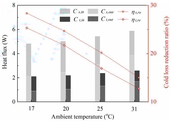 Figure 6 further compares the cold loss recovery behaviors of the side and the topside freezer walls. When the ambient temperature is 20 °C, the cold loss at the inside surfaces of the two side modified freezer walls (Cs,in) is 5.0 W, and the corresponding outside one (Cs,out) is reduced to 2.4 W. Meanwhile, the cold loss at the inside surface of the topside modified freezer wall (Ct,in) is 2.2 W, and the corresponding outside one (Ct,out) drops to 1.0 W. In comparison to the original freezer walls, about 24.7% of the cold loss of side freezer walls and 21.7% of the cold loss of topside freezer wall are recovered by the heat pipes. With a raising ambient temperature, Cs,out increases from 2.1 W to 3.8 W, and Ct,out enlarges from 0.9 W to 1.7 W. The cold loss reduction ratios of side and topside freezer walls (ηs,re and ηt,re, respectively) significantly drops from 28.3% to 15.0% and from 25.3% to 12.8%, respectively. The cold loss recovery behavior of modified side freezer wall remains better than the topside one, and their cold loss recovery capabilities are both considerably restricted by a high ambient temperature.