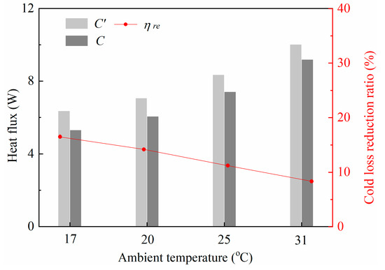 The overall cold loss recovery performances of the modified freezer at various ambient temperatures are presented in Figure 7. The cold loss of original freezer increases from 6.4 W to 10.0 W, while that of the modified freezer raises from 5.3 W to 9.2 W with a raising ambient temperature. Correspondingly, the cold loss reduction ratio of the freezer (ηre) decreases from 16.5% to 8.3%. The results indicate that more cold loss could be recycled by the heat pipes when the refrigerator runs with a lower ambient temperature. In general, the energy saving of the improved refrigerator is reliable when ambient condition varies within a typical range.