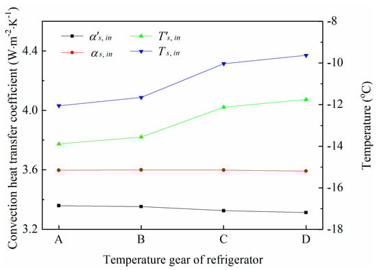 When the ambient temperatures, Aeva and Xin, are fixed to 25.0 °C, 0.146 m2, and 16%, respectively, and the temperature gears are given as A~D, the measured boundary conditions are utilized to further compare the performances of original and improved refrigerators. The representative heat transfer parameters of original and improved side freezer walls are shown in Figure 8. As the temperature gear is adjusted from A to D, the inside convective heat transfer coefficient for the original side wall (α’s,in) remains close to 3.34 W·m−2·K−1, whereas that for the modified one (α′s,in) remains at about 3.59 W·m−2·K−1. The inside surface temperature for the modified side wall (Ts,in) raises from −12.1 °C to −9.6 °C; and the inside surface temperature for the original side wall (T’s,in) raises from −13.9 °C to −11.8 °C. When the temperature gear changes from A to D, Ts,in remains higher than T’s,in, and their difference slightly enlarges from 1.8 °C to 2.1 °C. The enhancement on the inside heat transfer of the modified side freezer wall intensifies as the inside temperatures of the refrigerator raise.
