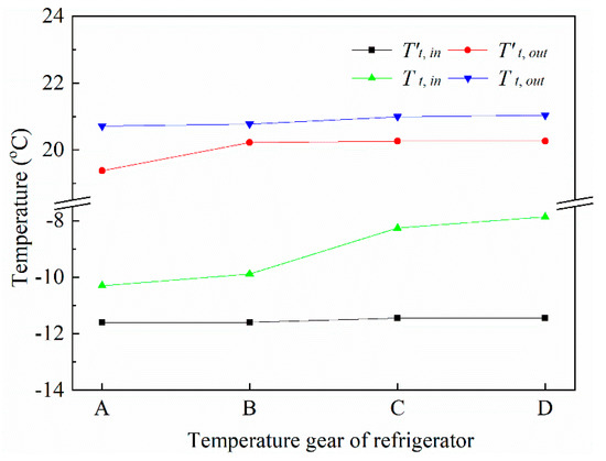 The topside freezer wall of the improved refrigerator is with boundary condition 1, and thus the bilateral heat transfer characteristics are affected by the heat pipe. Figure 9 shows the surface temperature comparison between the original and the modified topside freezer walls under different temperature gears. Take temperature gear B for example, the outside surface temperature increases from 20.2 °C to 20.8 °C after adding the heat pipe, and the inside surface temperature correspondingly increases from −11.6 °C to −9.9 °C. The existence of the heat pipes changes the temperature distribution in the topside freezer wall and reduces the temperature gap between its outside surface and ambient air. The phenomenon indicates that a considerable heat energy is transported from the fresh food compartment and flow into the freezer along with the outside heat leakage. Besides, the inside surface temperature for the modified topside freezer wall (Tt,in) raises from −10.3 °C to −7.9 °C, and the outside surface temperature for the original topside freezer wall (T’t,out) slightly increases from 19.4 °C to 20.3 °C. The inside surface temperature for the original topside freezer wall (T’t,in) and the outside surface temperature for the modified topside freezer wall (Tt,out) remain close to −11.5 °C and 20.8 °C, respectively. Results confirm that the influence of heat pipes intensifies as the inside temperatures of the refrigerator raise.