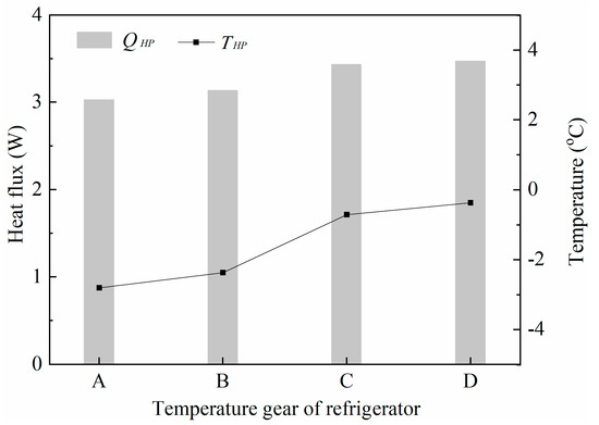 The heat transfer behaviors of the heat pipes are further studied to support the above analyses. As shown in Figure 10, the temperature of the heat pipes (THP) raises from −2.8 °C to −0.4 °C as the temperature gear is varied from A to D, and the difference between the air temperature at the fresh food compartment and THP enlarges from 4.9 °C to 5.4 °C. Correspondingly, the heat transfer capability of heat pipes enhances and its heat flux (QHP) increases from 3.0 W to 3.5 W. Heat pipes provide a cold loss recovery function for the freezer, and the heat shunt amount is closely affected by the temperature gear of the refrigerator. Since the temperature of evaporating sections of heat pipes in the fresh food compartment is close to 0 °C and is much higher than the temperature of the original evaporator of the refrigerator, the problem of frosting in the evaporating sections of the heat pipes is less serious.
