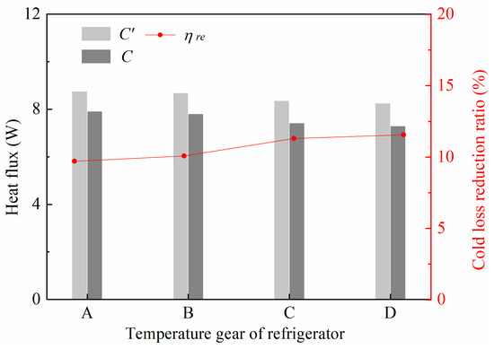 Figure 11 compares the cold losses of the original and the modified freezer to overall evaluate the cold loss recovery behaviors of the improved refrigerator. Taking temperature gear B as an example, the cold loss of the freezer drops 0.9 W after adding heat pipes, which means 10.1% of cold loss can be recovered by the heat pipe. When the temperature gear varies from A to D, the cold losses of the original and the modified freezers both decrease 0.6 W, and the cold loss reduction ratio (ηre) correspondingly increases from 9.7% to 11.6%. On the whole, the improved refrigerator can effectively reduce the cold loss of the freezer even if the temperature gear of the refrigerator changes. The energy saving performance slightly enhances as the cold loss amount decreases with increasing inside temperatures of the refrigerator.