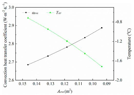 The heat transfer area of the evaporating sections of heat pipes (Aeva) is firstly reduced from 0.146 m2 to 0.094 m2, while the ratio of length to width remains constant. The variations of the average convective heat transfer coefficients of the upper and the lower surfaces of the evaporating sections of heat pipes (αeva) and the temperature of the heat pipes (THP) are shown in Figure 12. As the heat transfer area reduces 9.8%, 19.0%, 27.8%, and 36.0%, αeva raises gradually from 2.68 W·m−2·K−1 to 2.83 W·m−2·K−1, 2.78 W·m−2·K−1, 2.73 W·m−2·K−1, and 2.89 W·m−2·K−1, respectively. Correspondingly, THP decreases from −0.7 °C to −0.9 °C, −1.2 °C, −1.4 °C, and −1.7 °C, respectively. The convective heat transfer capability of the evaporating sections of heat pipes per unit area gradually increases as the temperature gap between the heat pipes and the fresh food compartment enlarges. The heat transfer area of the evaporating sections of heat pipes could considerably affect the internal heat transfer of the improved refrigerator.