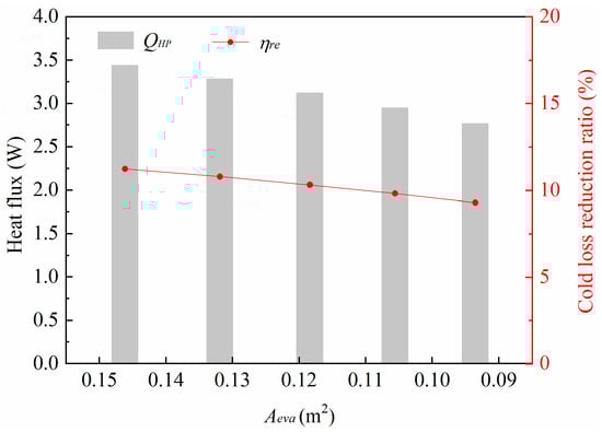 The impact of heat transfer area reduction of the evaporating sections of heat pipes on the overall behaviors of the improved refrigerator are further shown in Figure 13. When Aeva reduces from 0.146 m2 to 0.094 m2, the heat flux of the heat pipes (QHP) drops from 3.4 W to 2.8 W, and the heat flux decreasing ratio is about 80.4%. Correspondingly, the cold loss reduction ratio (ηre) decreases from 11.2% to 9.3%, and its decreasing ratio is about 82.8%. Results indicate that reduction on the heat transfer area of heat pipes in the fresh food compartment weakens the heat transfer of the heat pipes and thus causes a performance degradation of the improved refrigerator. However, the simulation also proves that a slight sacrifice of heat transfer area for the convenience of design and manufacture of the improved refrigerator is feasible.