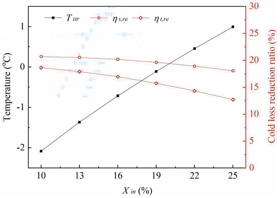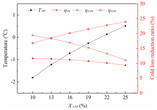 Furthermore, the locations of the condensing sections of heat pipes in the side and the topside freezer walls are individually varied, and the behaviors of the improved refrigerator are evaluated to reveal the energy saving difference at the side and the topside freezer walls. The ratio of wall thickness inside of heat pipes to the whole side wall thickness (Xs,in) is varied from 10% to 25%, while that for topside freezer wall (Xt,in) is fixed to 16%, and the calculated results are shown in Figure 16. THP raises from −1.8 °C to 0.5 °C, ηre decreases from 11.7% to 9.4%, and their variation ranges are smaller compared with the operating states with changing Xs,in and Xt,in together (shown in Figure 14 and Figure 15). In particular, ηs,re drops from 19.4% to 11.1% whereas ηt,re raises from 16.8% to 24.0%. The temperature distribution at the topside freezer wall is affected by the raising THP, and thus its cold loss drops, even if Xt,in is constant. For comparison, the behavior of the improved refrigerator is shown in Figure 17 as Xt,in is varied from 10% to 25% with a fixed Xs,in. Correspondingly, ηs,re increases from 16.0% to 18.2%, ηt,re reduces from 23.7% to 13.6%, THP slightly raises from −1.0 °C to −0.3 °C, and ηre decreases from 11.5% to 10.5%. The performance responses to the variation of Xt,in are much weaker than those of Xs,in, which indicates the location of condensing sections of heat pipes at the topside freezer wall plays a more important role. Generally, properly adjusting the location of condensing sections of heat pipes at each freezer can vary the cold loss recovery capability of the improved refrigerator, and the energy saving design is feasible as Xs,in and Xt,in are changed between 10% to 25%.