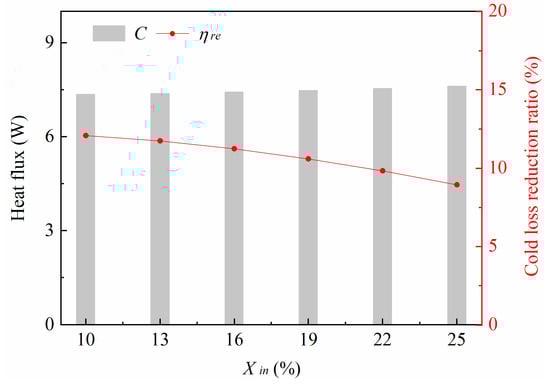 Thereafter, given the maximum Aeva of 0.146 m2, the common ratio of wall thickness inside of heat pipes to the whole wall thickness (Xin) is changed from 10% to 25%, and the temperatures of heat pipes and cold reduction ratios of side and topside freezer walls are shown in Figure 14. The temperature of heat pipes (THP) raises from −2.1 °C to 1.0 °C with increasing Xin. Correspondingly, the cold loss reduction ratio of the side freezer wall (ηs,re) and that of the topside freezer wall (ηt,re) gradually decrease from 20.7% to 18.1% and from 18.6% to 12.7%, respectively. Given the same location of the heat pipe, the cold loss reduction capability of the modified side freezer wall remains higher than that of the topside one, but the gap between ηs,re and ηt,re significantly enlarges from 2.1% to 5.4%. The temperature of heat pipes is closely related with its installation position in the freezer walls, and the cold loss reduction behavior of the side freezer walls is relatively more stable, even if the location of heat pipes changes. Correspondingly, Figure 15 shows the overall behaviors of the modified freezer with increasing Xin. Cold loss of the modified freezer (C) slightly drops from 7.3 W to 7.6 W, and cold loss reduction ratio (ηre) decreases from 12.1% to 8.9% as Xin increases from 10% to 25%. The overall cold loss recovery amounts of heat pipes at various installation positions remain relatively stable. These results certify the reliability of the energy saving function of the improved refrigerator.