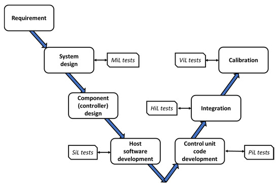 In the HiL phase, the developed control algorithms with mathematical models running in real-time can be fully installed on a control hardware to communicate and actuate real/emulated components. A typical HiL system integrates various software and hardware-based units such as physical components (not in all testbeds), component emulators, DSP/FPGA unit, MATLAB/Simulink® desktop environment, real-time interface (RTI), real-time workshop (RTW), and controller area network (CAN) [8]. In the HiL implementation stage, exerted road load on wheels can be manipulated in a real-time manner by introducing an input driving cycle to the physical testbed to examine operating conditions as if in a real driving environment. The main objective of HiL implementation is to experimentally test and verify the feasibility, accuracy, high dynamic response, scalability, and reliability merits of a designed control algorithm to guarantee its real-world applicability. The HiL test ensures savings in design cost and time by reducing the total development cycle of vehicle calibration as it indicates how an EMS control unit, and consequently the plant’s components, will communicate and behave in a real vehicle. In other words, it provides a validation method for development engineers for the safety and precision of the control system before an actual mule vehicle is available. Hence, once an EMS is designed and verified in a closed-loop manner through HiL, it can ideally be transmitted to a vehicle-in-the-loop (ViL) testbed without design modifications, expecting that the proposed strategy can represent identical features. Considering the discussed phases, Figure 1 recapitulates the chronological design steps known as the “V” development process [7].