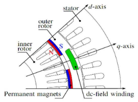 Due to their unique electromechanical features, electrical variable transmission (EVT) devices offer opportunities as a substitute solution to conventional transmission systems. The EVT encompasses two concentric rotors, an inner and outer, which are nested in a stator frame for mechanical, electrical, and electromagnetic energy exchange and transfer [46,47]. This makes EVT a suitable choice for use in applications where continuously variable and electric drive are combined with power generation components to provide improvement in overall efficiency and functionality. Example applications include but are not limited to transmission systems in hybrid electric vehicles (HEV), constant speed power take-off with mechanical drive and electric capability, and combined mechanical and electric drive for auxiliaries, electric clutches, and torque converters.
