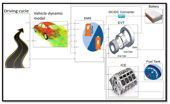 The architecture of an EVT-equipped HEV consists of an inner rotor connected to ICE and an outer rotor connected to the wheels through their corresponding shafts. The possibility of decoupling the wheel and engine speed can enhance the vehicle performance as the engine can operate at desired operating points [48,49]. In addition, there would be advantages of shorter maintenance intervals by preventing the mechanical losses of the gears’ involvement since an electromagnetic approach can be used to split the power needless to a planetary gear system. The net power generated by the engine can partially supply the power required by the wheels while converting the remaining part to electrical form to supply the stator or be stored in the battery for propulsion [37]. In an EVT-based HEV topology, two electrical ports at the inner rotor and stator are connected to two back-to-back inverters. Figure 2 illustrates a schematic for an EVT-based passenger HEV topology.
