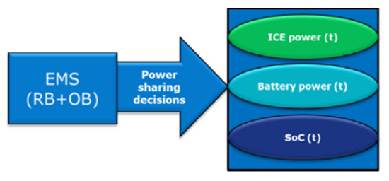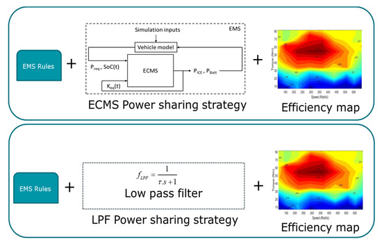 The EMS block, consisting of a rule-based (RB) combined with an optimization-based (OB) approach, is the core of the power sharing control subsystem toward reaching the desired energy management objectives. The main problem of standalone RB strategies is being subjective to predefined perceptions, leading to limited objectives such as battery SoC maintenance being addressed. However, they usually end up to non-optimal solutions regarding objectives such as minimized fuel consumption. Therefore, to provide a robust EMS block, in this study, a RB-based strategy was defined and linked to OB-based strategies such as low pass filter (LPF) and ECMS for power sharing, as illustrated in Figure 5. The EMS selects operating points and modes to share the requested power between the battery and the ICE and satisfy the control objectives. The EMS must deliver the power in a way that the required driving power is fully satisfied. It operates the ICE by considering its efficiency map and charges the battery provided it is not violating the charging limitations. The SoC needs to be sustained between its intuitively and alterable defined maximum (i.e., 80%) and minimum (i.e., 75%) values, providing initial and final SoC values close enough to each other. All the objectives and their constraints need to be satisfied while minimizing the fuel consumption.