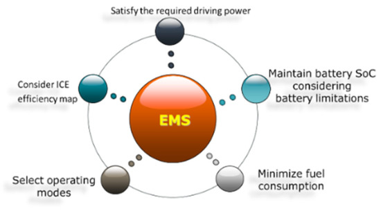 The constraints and objectives considered for the optimization are explained in detail in the ongoing section. To recapitulate the EMS role, the considered goals are illustrated in Figure 6. The following subsections introduces the employed RB and OB strategies. The effective capability of the used EMSs in handling the goals were proven in previously performed simulation-based studies [37,38,39]. The present study focused on the real-time validation of the proposed strategies by performing HiL experiments in a real-time testbed. Prior to that, the next subsections will review the used RB and OB strategies in more detail.