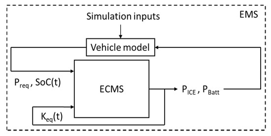 where QLHV represents the fuel lower heating value and η is the total drivetrain chain efficiency of the downstream components included in the backward modeling. Acting as the equivalence coefficient factor, Keqf is the conversion weight of the electricity into fuel. PP and PI are the gain multipliers controlling the stiffness and deviation of SoC around the nominal average of minimum and maximum values. Along this line, the ECMS provides instantaneous power sharing between ICE and the battery considering predefined SoCmin and SoCmax values, current SoC values SoC(t), time step Δt, and feedback gain multiplier μ as the fine-tune decision variable. To this end, ECMS updates the instantaneous equivalence factors by way of counteracting SoC deviations to maintain the SoC proportionally when it is reaching its maximum/minimum allowable values, supporting discharging/charging the battery, respectively. Figure 7 illustrates a simplified flowchart of input and output for the ECMS states.