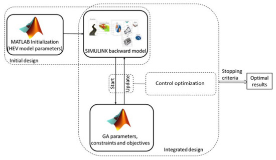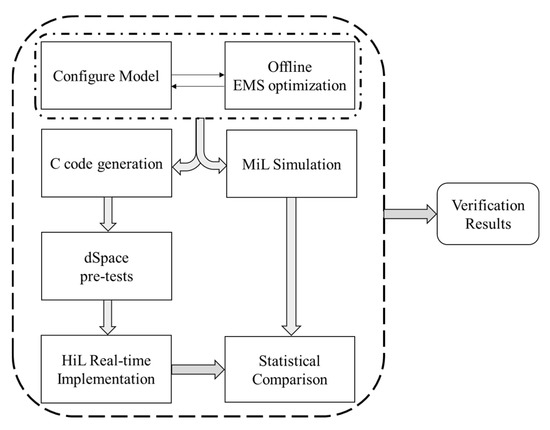 The need for the reduction in our carbon footprint has coincided with upward fuel prices, which has prompted an increased focus in the search for energy-saving solutions related to the transportation sector. Hence, unleashing the maximum potential of hybrid and electric vehicles at different fleet and standalone energy management design levels is at the forefront of research in the automotive industry [1,2,3]. The energy management strategy (EMS) unit is the heart of power sharing control toward addressing the consumption-friendly objectives of electric vehicle design. Compared to their conventional counterparts, hybrid electric vehicles (HEVs) can offer lower fuel consumption and still provide a similar/enhanced performance. However, as HEVs usually comprise two or more energy supply sources, developing their architectures with an efficient EMS involves a plethora of complexities related to design, integration, and implementation. Due to these cost-effective complexities, the plausibility of any control strategy requires assessment through various testing and validation procedures before embedment in the electronic control unit (ECU) of an on-road vehicle [4]. In this regard, the response and accuracy of a control strategy is of great significance for extensive verification through the use of a complete chain of tools. Toward real-world applicability, the model-based design of a plant and its EMS include various steps from the development to validation phases. This generally starts with functional system definitions and ends with deploying the design to a real operating environment under offline system modeling, control algorithm synthesis, simulation analysis, and online vehicle implementations [5]. To this end, first, a model-in-the-loop (MiL) development must be performed in which the integrated plant and the corresponding EMS controller models are built and set up in a desktop environment (i.e., MATLAB/Simulink®) to be examined over a complete driving cycle. This considers a totally software-based and iterative trial and error approach toward achieving an initial design with good flexibility and low cost in a short period [6]. In this phase, it is possible to perform fast EMS design alternations to investigate corresponding effects on a set of predefined objectives.