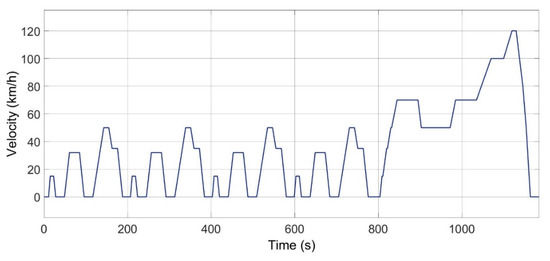 This section overviews the case scenarios aside from the test procedure considered for verification purposes. Two case studies of the methodically discussed ECMS and LPF energy management approaches, each combined with the RB strategy (see Figure 9), were investigated for MiL versus HiL examinations. The cases were tested over a complete driving cycle of the New European Driving Cycle (NEDC), plotted in Figure 10, as the input of simulations and real-time implementations.