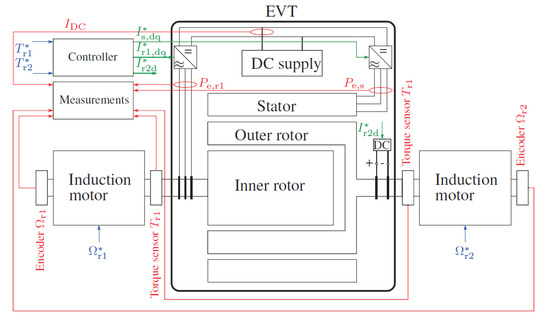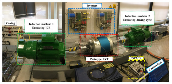 Figure 13 presents a panorama of the laboratory experimental setup used for the real-time implementation. The EVT machine with 120 kW rated power was placed in the middle and coupled to two 30 kW induction motors located at the left (connected to inner rotor) and right (connected to outer rotor) sides. The two electrical ports at the inner rotor and stator were connected to two water cooled 150 kW and 100 kW inverters, respectively.