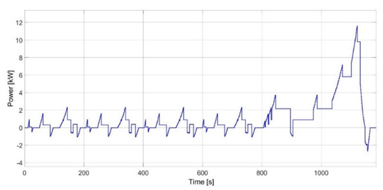 On the right-hand, a second induction motor was connected to the outer rotor to emulate the road profile input based on the NEDC. The battery was replaced by a 40-kW dc power supply in the test bench. Torque sensors (with a maximum measurable torque of 100 Nm) and encoders were used to measure the torque and rotational speed of the inner and outer rotors, respectively, and the electrical power flows were measured by using a power analyzer. It is noteworthy that the measuring limitation of the setup’s torque sensors (T < 100 N), maximum speed limitation of the inner rotor (Ωr1 < 4300 rpm), maximum speed limitation of the outer rotor (Ωr2 < 4300 rpm), and a setup safety shutdown limitation, related to the difference between the inner and outer rotor speeds (|Ωr1 − Ωr2| < 4000), were already considered in the optimized blocks uploaded to the control units. The dSPACE MicroLabBox was used with a fixed time step of TS = 0.0001 s for the components’ local control and TS = 1 for the EMS to ensure adequate data resolution. Table 4 represents the specifications of the setup parameters in more detail, and Figure 14 plots the demand power of the cycle considered for the examinations.