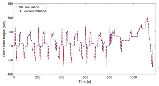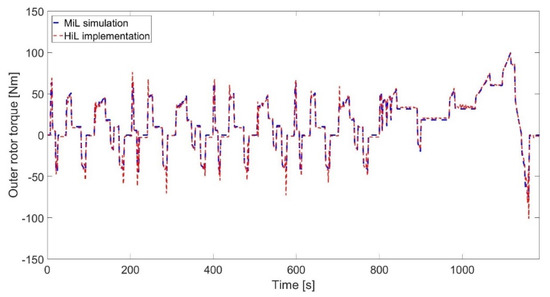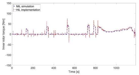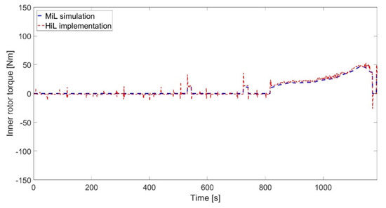 After performing the HiL implementations over the NEDC, real-time results for the inner and outer rotor actuations including the torque and speed dataset were achieved and stored. These results were compared with the corresponding ones acquired from the MiL simulations. The MiL vs. HiL results were plotted to observe the response performances and agreement accuracies for the studied cases. Accordingly, the statistical performance indices were applied over those dataset pairs, and calculated results are provided for long-term verification as follows.