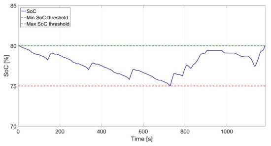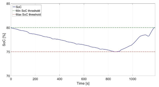 In the “battery-only” mode, a threshold of requested speed will be considered to turn off the ICE, and the battery pack supplies all the requested power, seeing that the battery SoC does not violate its minimum allowable value (i.e., predefined by the rules).