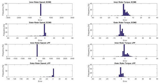 For the LPF-based EMS case, Figure 15 illustrates the results of the outer rotor torques. The speed results for the same rotor are plotted in Figure 16. With regard to the inner rotor, the achieved speed and torque results of the same case are presented in Figure 17 and Figure 18, respectively. Figure 19 illustrates the obtained SoC for this case. For the ECMS-based case study, Figure 20 illustrates the results for the outer rotor torques, while the speed results for the same rotor are plotted in Figure 21. Consequently, the speed and torque results of the inner rotor for this case are presented in Figure 22 and Figure 23, respectively. Figure 24 illustrates the obtained SoC for this case. Considering Figure 15, Figure 16, Figure 17 and Figure 18, Figure 20, Figure 21, Figure 22 and Figure 23, an investigation of the results through the cycle indicates that the actual torque and speed values obtained from the HiL implementations could closely follow the MiL simulations with well-matched responses for both of the studied EMSs. Along the same line, Figure 25 provides the error histogram for the investigated MiL vs. HiL occurrences where normal distributions around zero error values were favorably observed. The allowable SoC range considered 75% for the minimum and 80% for the maximum thresholds. As can be seen in Figure 19 and Figure 24, both employed strategies could well-maintain the SoC by achieving close enough initial and final values as desired. Regarding the MiL vs. HiL results, some inevitable mismatches related to noises were observed. These inevitable deviations could be expected, as has also been widely observed in the results of similar studies performed previously such as in [8,25,26,62]. This can be interpreted as mismeasurements imposed on the sensors by the laboratory’s environmental conditions, machine vibrations, or abrupt accelerations of the induction machines. Regarding the minor noises, they can be more readily recognized where the measured HiL data exhibited values slightly greater/smaller than zero whereas the MiL dataset appropriately followed zero values for the same instants. From what was physically observed in the lab through multiple similar examinations, there were no rotational actuations for those moments in the HiL tests, making them indeed comply with the MiL results. Hence, for the mismeasurements, it can be seen that vibrations coming from a rotating rotor (e.g., outer) would slightly affect the measuring quality of a standstill rotor’s sensor (e.g., inner). Furthermore, noises from the lab environment, the testing conditions, and the air quality (e.g., dust, temperature, humidity, etc.) might cause these types of inevitable noises to be recorded. On the other hand, other mismatches were observed where the actuations started undertaking great changes. As expected, when sudden accelerations were imposed by either of the two induction machines (e.g., see Figure 15, t = 200 s), the measuring quality was affected by exhibiting an overshoot for a short instant (inertia effect).