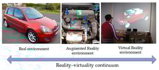 In recent years, many automotive manufacturers have developed a keen interest in augmented reality (AR), mainly due to its accessibility and potential for generating innovative solutions. AR is a form of human machine interaction (HMI) in which virtual components are inserted and superimposed on the real world, creating the illusion of an ‘enriched’ reality. It allows users to obtain certain information they need about some aspects or procedures directly in the working environment [] and it has the potential to enrich a person’s sensory perception []. Based on Milgram’s definition of a reality‒virtuality continuum [], AR represents a component part of mixed reality (MR), which is the merging of the real and virtual worlds. Milgram’s concept of a reality‒virtuality continuum is exemplified for the automotive industry in Figure 1. The applications of AR range from industrial to everyday life activities, in various domains, like manufacturing, robotics, healthcare, education, military, entertainment and so on. There are several extensive studies that address the implications and impact of AR on industry, as well as the challenges and directions of development in this field [,,,,,].
