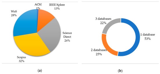 Distribution of the papers according to the research database (a) and the number of databases where they were found (b).