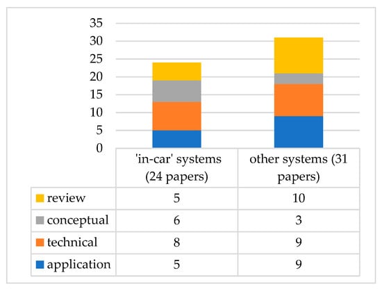 The methodology by which the data were extracted from the selected articles was implemented by the authors by cross-checking. One of the authors of this study systematically extracted relevant information from the articles and these were cross-checked by the other two to validate the correctness of the extracted data. Two main categories were defined in which the selected data could be classified from the beginning of the analysis: ‘in-car’ systems (containing works relating to systems designed to help drivers) and ‘other’ systems (developed in other sectors of the automobile industry). For each of the two main categories, other subcategories or groups were identified during the review process. They were divided according to certain common characteristics. The decision to keep, modify, or remove one of the identified categories was made by the two coders, who also verified the accuracy of the extracted information.
