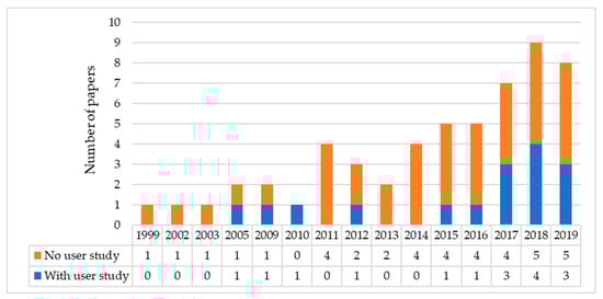 Distribution of the reviewed papers according to the year of publication, classified as articles with or without a user study.