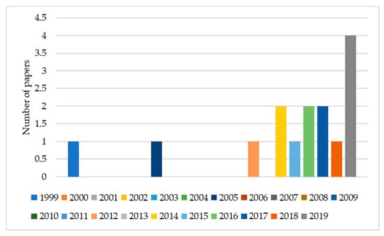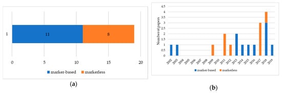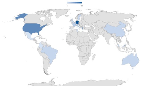 Some statistics regarding the year of publication and the origin of the studies from a geographical point of view for the entire sample are presented in Figure 5 and Figure 6. As can be observed, the amount of research has increased from year to year, starting from 1999. From the total number of papers, a percentage of 29.09% contain a user study. To determine the origin of the study, the affiliation of the first author was considered as reference. In this regard, 54.55% (30 papers) of publications were developed in Europe, 16.36% (9) in North America, 14.55% (8) in Asia, 7.27% (4) in Oceania, 5.45% (3) in South America and 1.82% (1) in Africa. Most of these studies come from Germany (21.82%), the USA (14.55%) and Greece (9.09%). This is explained by the fact that many companies that produce devices dedicated to the use of AR, as well as research groups, are located in these countries, as stated in [].