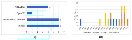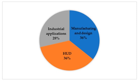 AR is a technology that has gained popularity in the field of the automotive industry in recent years, and systematic reviews have shown that AR applications have great potential in this field [,]. From the selected papers for our research, a total of 15 review articles were found, as shown in Figure 4. Most of them are not exclusively focused on the use of AR in the automotive industry, but they do mention this area, offering relevant information on how this technology can provide improvements in various applications. The distribution of the review articles according to the year of publication is shown in Figure 7. From the 15 articles identified, six of them focus their research on the field of manufacturing, four approach the industry field in general, and five refer to AR systems used to help drivers, like HUDs (Figure 8).