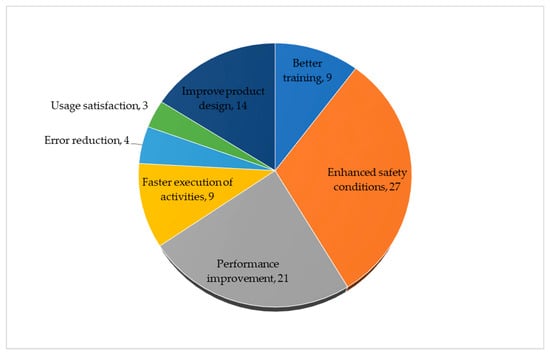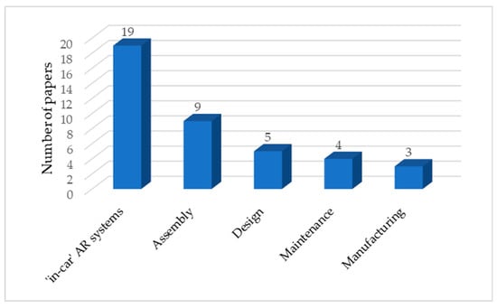 Ergonomics aspects were evaluated in 23.81% of the articles. Ergonomic research conducted to determine the number of requirements for designing AR systems to assist automotive service technicians were proposed in [,]. A reference model to analyze the experience of workers from the automotive industry was developed in []. Other papers were investigating automotive interior ergonomics [,].
