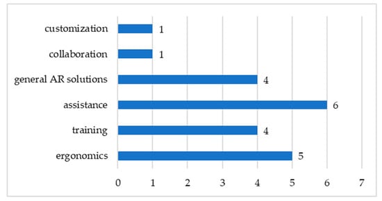 For the second category referring to ‘other’ AR systems, six subcategories were identified: product customization, remote collaboration, general AR solutions, assistance, training and ergonomics (Figure 11). Most of the papers (28.57%) have been included in the ‘assistance’ subcategory because they present works in which AR is used to assist people in accomplishing various tasks: manual assembly [,,] human-robot collaborative assembly [,] and prototyping in the design process [].