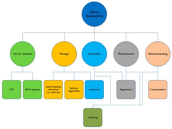 Two papers could not be included in any of these subcategories: the work from [], which describes a collaborative AR system that allows participants to share a 3D space, and [], where a web-based platform for designing and customizing a car hood was presented. The other works (19.05%) address AR aspects that can be used as general solutions. In [] the author has developed and evaluated a new markerless tracking system for AR applications. Contributions on improving the accuracy of AR tracking were also provided in []. A new method of rendering which increases the quality of the images projected during the car design process was described in [], and a new method to support decisions for the aeronautical transportation industry was proposed in []. Figure 12 presents a summary of AR applications for the automotive industry that were identified in the selected articles.